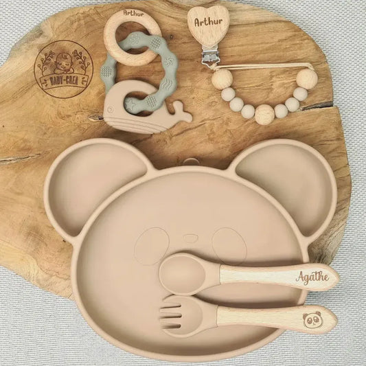 Wir bieten Artikel für Babys und Kinder an, personalisiert oder nicht: Silikongeschirr, Essenssets, praktische Accessoires, Spielzeug, Textilien und einzigartige Geburtsgeschenke.