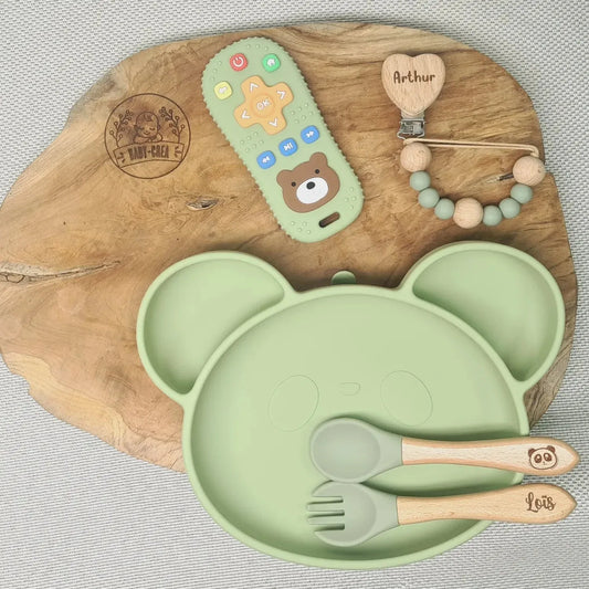 Personalisierte Baby-Mahlzeitbox aus Silikon – Teller, Besteck, Spielzeug