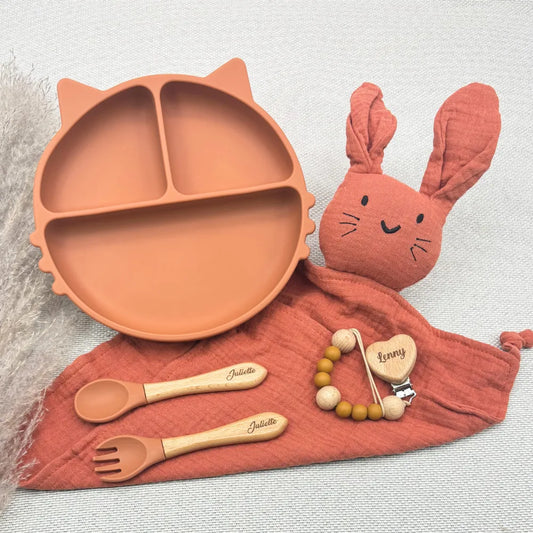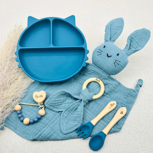 Personalisierte Baby-Mahlzeitbox – Katzen-Teller, Hasen-Schmusetuch, Schnullerband & graviertes Besteck