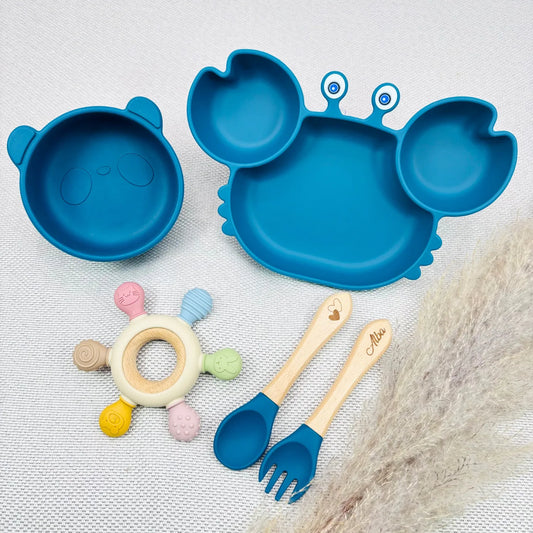 Personalisierte Baby-Mahlzeit-Box Krabbe – Teller, Schüssel, Spielzeug, Besteck