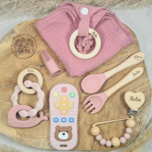 Personalisierte Baby-Geschenkbox – Besteck mit Namen, Delfinring & Schnullerhalterung