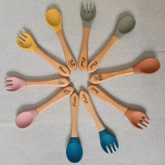 Personalisierte Baby-Bestecke – Natürliches Holz & Lebensmittelechtes Silikon – Farbe Tomatenrot